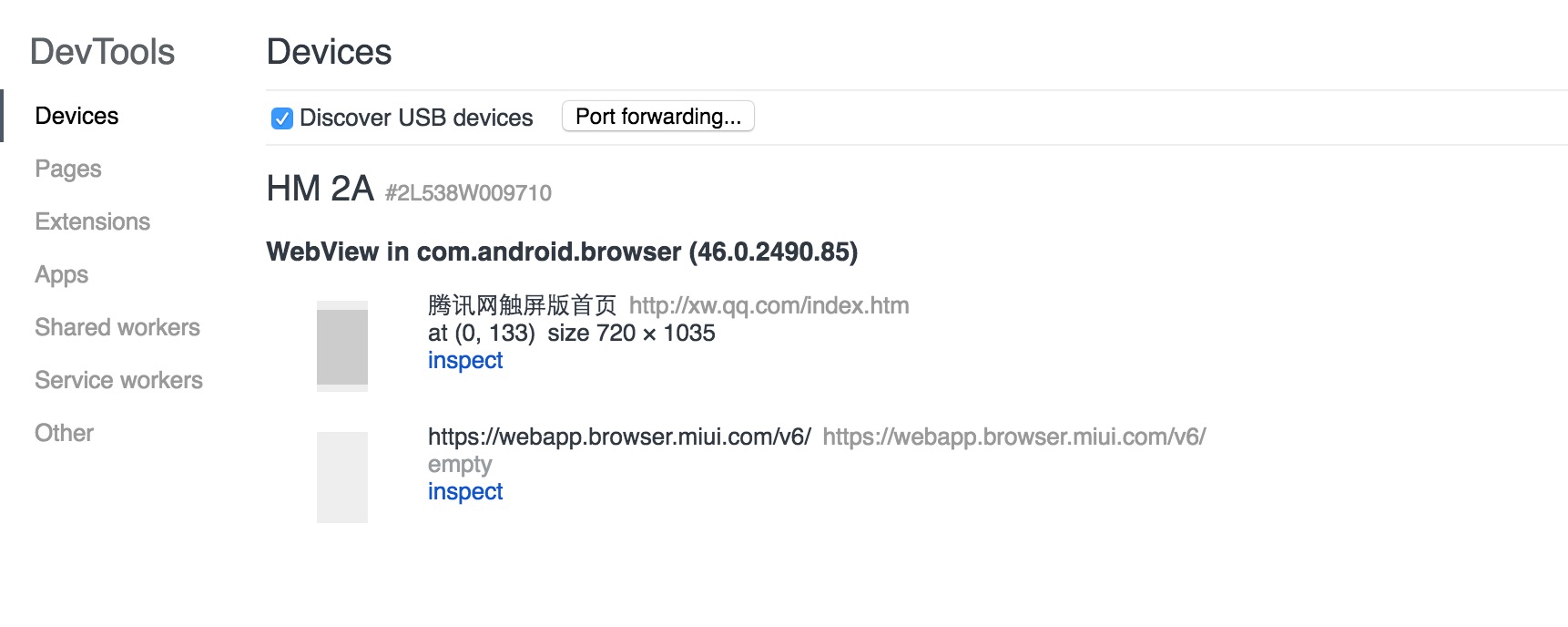 - 手机访问页面(浏览器或webview),PC中Chrome浏览器打开chrome://inspect